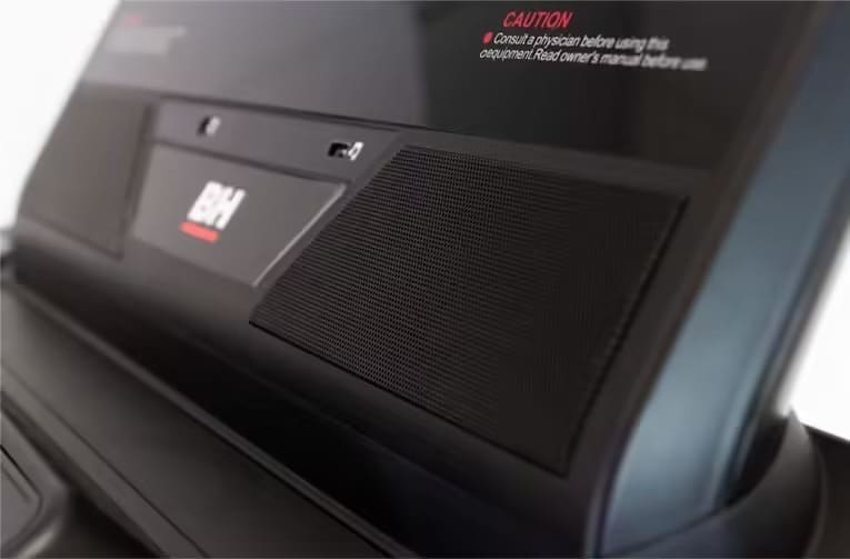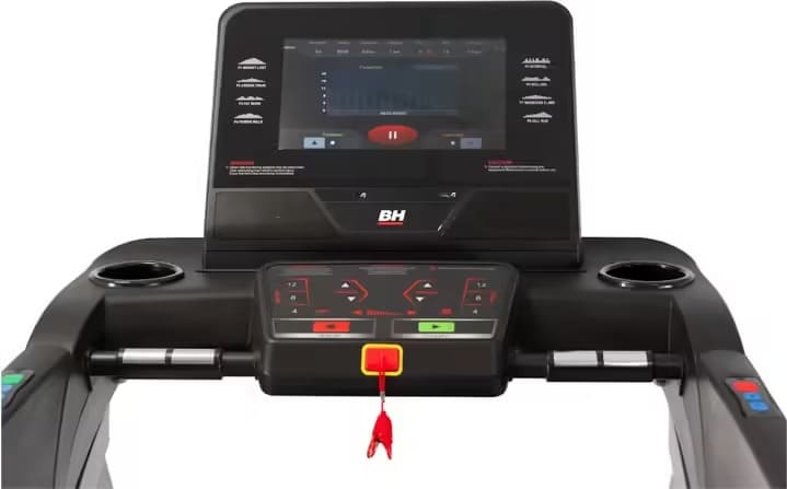 Tapis de course BH Vanquish Multimedia avec écran TFT, vitesse jusqu’à 22 km/h, surface 150×55 cm. Compatible Kinomap et Zwift pour des entraînements immersifs à domicile.